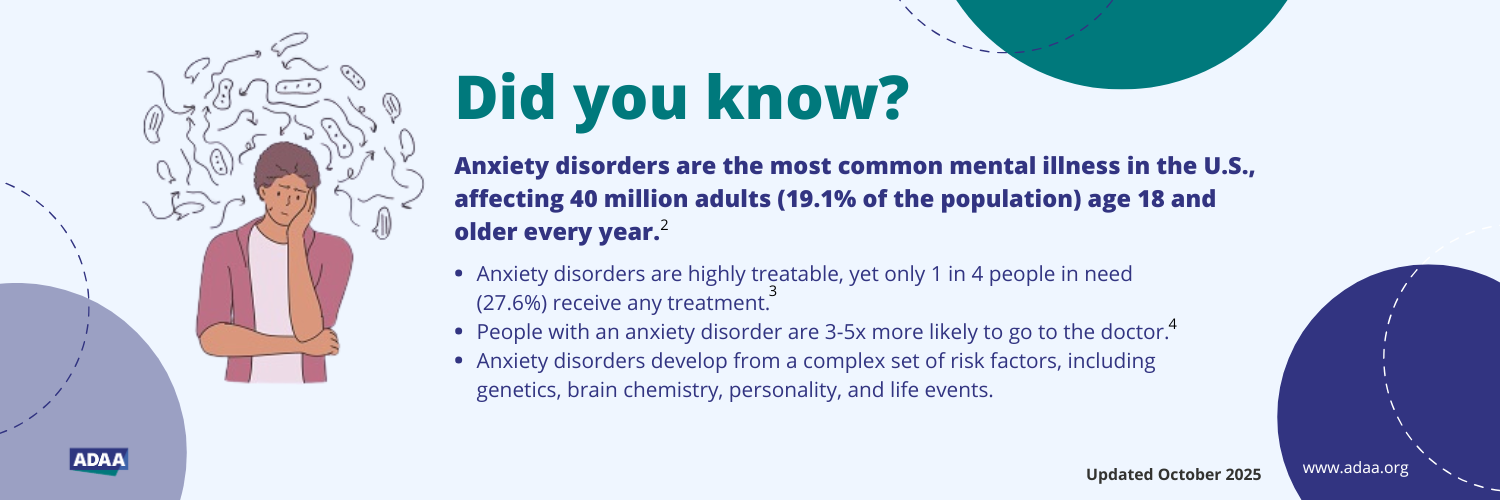 - National Alliance on Mental Illness (NAMI), Anxiety Disorders, accessed October 2025, https://www.nami.org/about-mental-illness/mental-health-conditions/anxiety-disorders/
